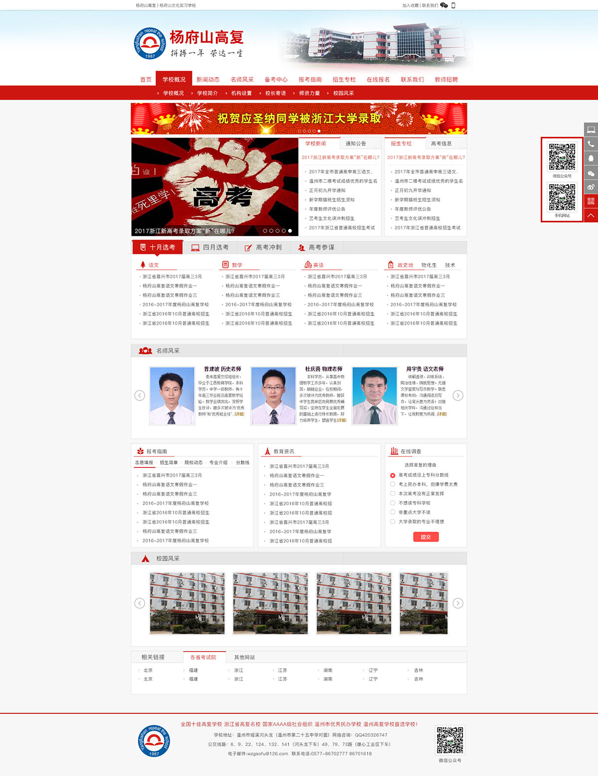 溫州市甌海區(qū)楊府山文化補習(xí)學(xué)校(簡稱:溫州楊府山高復(fù)、楊府山高復(fù),前身是溫州師范學(xué)院高復(fù)班、溫州中學(xué)高復(fù)班),是上海金太陽教育集團下屬機構(gòu),創(chuàng)辦于1987年,是溫州市區(qū)唯一的一所經(jīng)教育局批準的專門從事高考文化補習(xí)的辦學(xué)單位。2007年與溫州地區(qū)辦學(xué)歷史最悠久的高復(fù)學(xué)校即金橋高復(fù)合并;2009年至今,共兼并了溫州市區(qū)、永嘉、瑞安等五個縣(市、區(qū))的六所高復(fù)學(xué)校、2010-2015學(xué)年辦學(xué)規(guī)模列居全省高復(fù)學(xué)校前四,2015-2017學(xué)年辦學(xué)規(guī)模居全省高復(fù)學(xué)校前二?!皸罡健笔钦憬「邚?fù)名校,是浙江省2009年新高考后唯一一所保持原有辦學(xué)規(guī)模的高復(fù)學(xué)校。學(xué)校分別被評為全國十佳高考復(fù)讀機構(gòu)、甌海區(qū)辦學(xué)評估優(yōu)秀學(xué)校、AAAA級中國社會組織(全省獨家)、甌海區(qū)優(yōu)秀社會組織、溫州市辦學(xué)評估優(yōu)秀學(xué)校。
